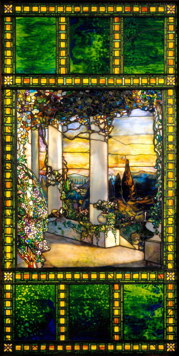 This vibrant and richly colored stained glass window incorporates a technique that layered colors, producing shadows and creating a multidimensional quality. Most noticeable in the lush landscape depicted in the central pane, this technique was used to great effect by Louis Comfort Tiffany and his workshop, thereby popularizing and establishing the technique as a hallmark of the artist's style.