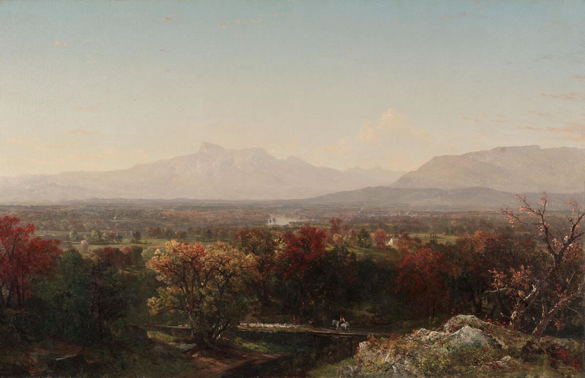 After railroad service to the area was improved in the early 1850s, the White Mountains in New Hampshire became a favored destination for tourists and artists seeking to commune with nature. New York-based Kensett painted several views, including this distant rendering across the Saco River of Mount Chocorua, one of the most distinctive peaks in the region.